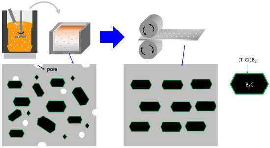 Al6061 alloy was melted in a graphite crucible by induction heating at a temperature of about 750 °C for 20–30 min. Degassing of the melt was performed with argon gas. After degassing, B4C particles preheated at 200 °C were added to the graphite crucible while continuing the stirring process. Stirring was maintained for 10 min at 800 rpm after finishing the B4C addition. After stirring, melt was poured into the preheated steel mold at 200 °C. The fabricated composites were cut into 100 mm × 100 mm × 10 mm pieces for the hot rolling process.