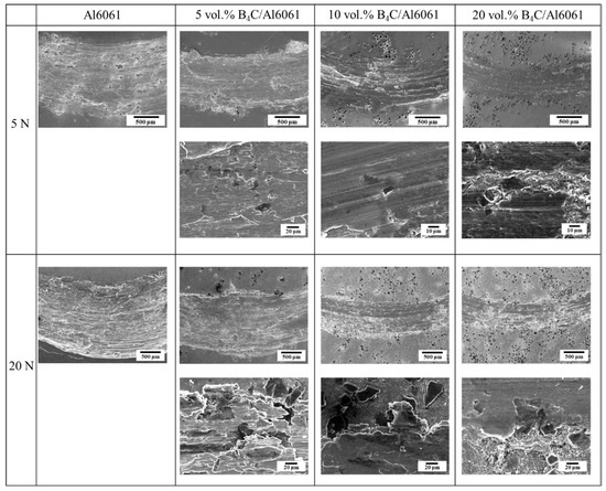 Worn surface SEM images of Al6061, 5 vol.%, 10 vol.%, and 20 vol.% B4C/Al6061 composites after wear tests at 5 and 20 N loads.