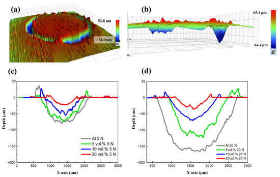 (a,b) 3D wear surface images of 10 vol.% B4C/Al6061 composites tested at 20 N load measured using an alpha step. The wear width and maximum wear depth of Al6061 and B4C/Al6061 composites were tested at (c) 5 N and (d) 20 N loads.