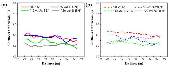 Figure 7 shows the coefficients of friction (COF) of the Al6061 and B4C/Al6061 composites according to the 5 and 20 N loads. In the case of Al6061 and the 5 vol.% B4C/Al6061 composites tested under 5 N load, the friction coefficients are almost identical. However, the COF of the B4C/Al6061 composites decreases as the B4C volume fraction increases. Table 2 shows a summary of the wear width, wear depth, COF, and hardness of the Al6061 and B4C/Al6061 composites. The average COF values of Al6061 and of the 5 vol.%, 10 vol.%, and 20 vol.% composites are 0.35, 0.37, 0.28, and 0.31, respectively. Although the COF of the 5 vol.% sample was slightly higher than that of Al6061, the COF of the B4C/Al6061 composites decreased with the addition of B4C. In the case of 20 N load, the average COF values of Al6061 and of the 5 vol.%, 10 vol.%, and 20 vol.% composites are 0.39, 0.31, 0.33, and 0.38, respectively. The COF of the composites decreases with the increasing vol.% of B4C and reaches a minimum of 0.28 at 10 vol.% B4C. Therefore, it is difficult to say that the friction coefficient decreases as the volume ratio increases. However, the COF of the B4C/Al6061 composites tested at 20 N also slightly decreased with the addition of B4C. Vickers hardness of the composites increased from 116.5 to 139.9 as the B4C volume fraction increased. Therefore, the results reveal that the wear amount and hardness of the B4C/Al6061 composites are inversely proportional. When the load was increased from 5 to 20 N, the wear width of Al6061 increased from 1303 to 2101 μm, and the wear depth increased from 80 to 156 μm, which are 0.61 and 0.95 times increases, respectively. When the load was increased from 5 to 20, the wear width and depth of Al6061 increased 1.5 or 2 times, while that of the composite increased 0.5 times. However, when the load was increased from 5 to 20 N, the wear width of B4C/Al6061 increased from 720 to 856 μm, and the wear depth increased from 20 to 36 μm, which are 0.18 and 0.8 times increases, respectively. As a result, the wear rate was decreased with increasing the volume fraction of B4C. Furthermore, wear rate showed a tendency to decrease as the applied load increased. The presence of hard B4C particles having good interfacial bonding with the Al matrix acts as an obstacle to wear of the soft Al matrix. Therefore, it is possible that the wear properties of the B4C/Al6061 composite will increase even further at a higher applied load.