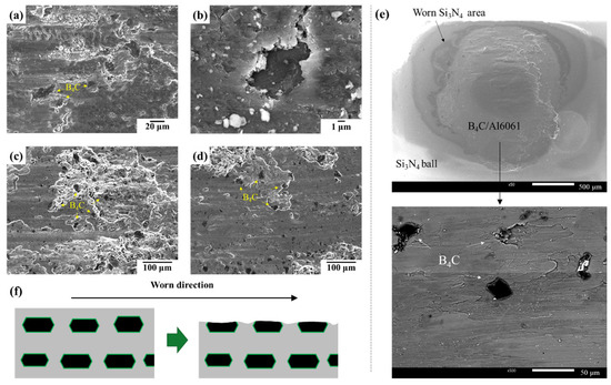 Surface SEM images of 20 vol.% B4C/Al6061 composites after wear test at (a,b) 5 N and (c,d) 20 N, (e) SEM images of Si3N4 ball after wear test, (f) Schematic of wear mechanism of B4C/Al6061 composite.