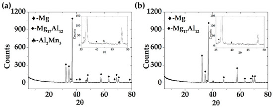 Figure 2 presents the XRD patterns of the AM60-AlN nanocomposite (Figure 2a) and AM60 alloy (Figure 2b). The characteristic peaks of Mg, as well as those in the low intensity of Al-Mn intermetallic particles (42.55° and 47.14°) and secondary phase of β-Mg17Al12 (35.95° and 40.07°), are revealed. However, no aluminum nitride peaks were detected, because of the low concentration (1%) of AlN nanoparticles in the AM60 matrix.