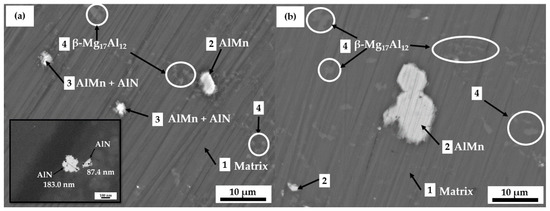 Figure 3 compares SEM images (×2000) of the AM60-AlN nanocomposite (Figure 3a) and AM60 alloy (Figure 3b) surface microstructures. On the recently polished surface of the α-Mg matrix (labeled as 1), clusters of particles (labeled as 2) appeared, which EDS elemental analysis (Table 2) suggests may be considered as the intermetallic Mn-rich particles of AlMn, in the presence of C and O elements, the contents of which were attributed to the reported effective nucleating particles of Al-C-O (Al2CO) [73]. The AlN nanoparticles (labeled as 3, Figure 3a) were observed as “attached” to those of AlMn, forming clusters. Although the content of Mg (64.4 wt.%, Table 2) was slightly higher than that of 42–58 wt.% given in the binary phase diagram for Al-Mg [74], the areas labeled as 4 were assigned to the β-Mg17Al12 secondary phase, present in both alloys.