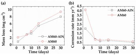 The change in mass (∆m) and annual corrosion rates (Equation (2)) are presented in Figure 5. After the first day, the mass loss of AM60 was of 2.20 ± 0.19 mg cm−2, twice greater than that of the AM60-AlN composite. At 7 days, the ∆m of both samples showed an increasing trend of up to 30 days, presenting 9.5 ± 0.21 mg cm−2 for AM60 and a lower value of 8.1 ± 0.19 mg cm−2 for AM60-AlN (Figure 5a). The calculated annual corrosion rates, based on ∆m values corresponding to 30 days, were 0.65 ± 0.01 and 0.55 ± 0.01 mm yr−1, for AM60 and AM60-AlN, respectively (Figure 5b). These values were influenced by the pH change over time and Mg2+ ions release (Figure 4).