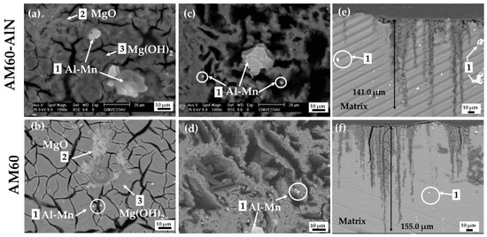 The Al-Mn particles are considered local efficient cathodes [79,80,81,82] and, thus, they subsist on the Mg-matrix after the removal of corrosion layers (Figure 6c,d). However, it has been reported that, in the presence of chloride ions (NaCl), the Al-Mn phase is unstable and may suffer de-alloying, forming Al(OH)3 with its posterior delamination [82]. Scanning Kelvin probe force macroscopy (KPFM) maps of the Volta potential difference measurements, for Al-Mn alloys immersed in NaCl solution, have shown the cathodic character of Al-Mn particles, as nobler than the adjacent Mg-matrix; thus, induced localized corrosion is observed in their vicinity [80,81]. The cross-sectional morphology of the AM60-AlN (Figure 6e) nanocomposite and that of the AM60 alloy (Figure 6f) revealed a maximum depth of 141.0 µm of less intensive localized attack in the case of AM60-AlN and 155 µm for the AM60 alloy.