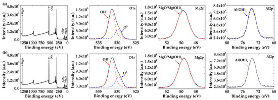 To complement the EDS elemental composition of the corrosion layers, formed on each alloy surface after 30 days of exposure to the acid rain model solution (SAR), XPS spectra analysis was performed (Figure 7). The binding energies (Table 4) of O1s, Mg2p, and Al2p were identified (Figure 7a,b). The high-resolution peak of O1s consists of two signals, according to the fitting-curves: the lower oxygen signal at 529.9 eV was attributed to MgO (O2−) and the high signal at 531.6 eV was associated with (OH−) present in Mg(OH)2, as the main corrosion product, as well as a part of Al(OH)3. On the other hand, the signal of Mg2p contains the contributions of MgO and Mg(OH)2 [83,84,85], and the signal of Al2p contains the contribution of Al(OH)3 [86].