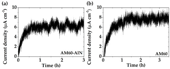Figure 8 presents the fluctuations in corrosion current density (at OCP) for the AM60-AlN nanocomposite (Figure 8a) and AM60 alloy (Figure 8b), after 30 days of immersion in SAR solution. It is notable that the AM60 current density (≈7.8 µA cm−2) and its average amplitude (5.0 µA cm−2) were higher than those of the AM60-AlN nanocomposite (≈6.1 µA cm−2 and amplitude of 3.0 µA cm−2).