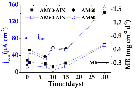 Change in time of jcorr and MR of AM60-AlN nanocomposite and AM60 alloy, exposed to SAR solution for up to 30 days.