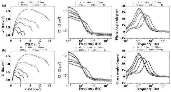 Figure 11 shows the Nyquist and Bode plots for the AM60-AlN nanocomposite and AM60 alloy exposed to SAR solution for different periods of immersion. After the first hour of immersion, the impedance diagram displayed two capacitive loops at higher (HF) and medium frequencies (MF), followed by the beginning of an inductive loop at low frequencies (LF). The HF-capacitive loop diameter, as a measure of the charge transfer resistance (Rt) at the alloy interface, depends on the double-layer capacitance particularities, including the effect of the formed corrosion layers [86,95,96,97,98,99,100,101,102]. Its value is inversely related to the corrosion rate through the Stern–Geary equation [95,96,98]. The MF-capacitive loop was associated with mass transport processes connected to the diffusion of the released Mg2+ ion through the layer of the corrosion product [95,96,97,98,99], while the LF-inductive loop may result from the beginning of localized corrosion on the alloy surfaces and/or linked to adsorption/desorption of intermediates on the electrode surface. The inductive loop could disappear when the corrosion protective layer is formed on the surface [95,96,97,98,99]. The increase in immersion time led to a rise in the diameter of both HF and MF capacitive loops, suggesting the formation of corrosion layers on the surfaces, acting as a physical barrier over time against the SAR aggressive media. The Bode plots were found to be in good agreement with those observed in Nyquist diagrams.