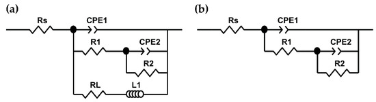 The EIS experimental data were fitted with two equivalent circuits, which correspond to the initial immersion period of 1 h (Figure 12a) and the longer period up to 15 days (Figure 12b) [103]. The main components of the suggested circuits were: R1 (Rt) and CPE1 double layer “capacitance” at the substrate/electrolyte interface; R2 (Rct) and CPE2 “capacitance,” both characteristic of the charge transfer process in the presence of the corrosion layer, through which the released ions of Mg2+ diffuse. The constant phase element (CPE) was introduced instead of a capacitor, to account for the dispersion of the time-constant due to different factors such as heterogeneities and surface roughness [95,98]. In addition, the circuit (a) includes RL and L1 as inductive resistance and inductance, respectively, presenting the dependence of the corrosion process from the surface coverage by the corrosion layer and its characteristics (porosity, cavities, and cracks). The fitted values of the circuit elements (Table 6 and Table 7) were used to compare the corrosion behavior of the AM60-AlN nanocomposite to that of AM60 (the circuits have a fitting of 10−4).