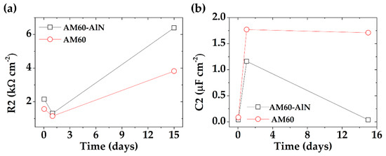 Figure 13a compares the evolution in time of charge transfer resistance (R2), corresponding to the AM60-AlN nanocomposite and AM60 alloy. According to the Brug Equation (12), the values of CPE2 (Table 6 and Table 7) were transformed to the capacitance values (C2) of the double layer in the presence of corrosion products, using Rs, R2, and n2 values [104,105] (Figure 13b). The increase in time of AM60 alloy capacitance (Figure 13b) may be attributed to the formation of a thicker, although less protective, corrosion layer (lower R2 values).