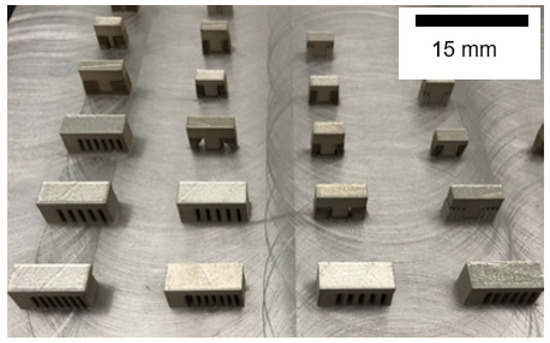 The 304L stainless steel samples with different dimensions are displayed in Figure 2. Samples were built with varied process parameters using a Renishaw AM250 SLM platform. The AM250 has a 200 W maximum fiber laser (IPG Photonics, Oxford, MA, USA) and contains a 250 mm × 250 mm × 300 mm build volume. 304L stainless steel gas-atomized powder with particle diameter of ~45 μm, purchased from LPW Technology, USA, was used to prepare the powder beds. Powders were melted in the beds’ surface by a fiber laser with 200 W maximum laser power, focused to a beam diameter of 140 µm. The built chamber for the experiment was under an argon atmosphere. The oxygen level inside the chamber was monitored to be below 1000 ppm and a constant recirculating argon gas flow was maintained to remove the possible condensates and ejecta generated during the building process.