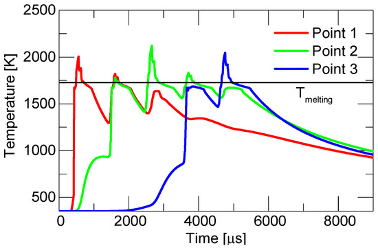 Figure 3 shows the temperature evolution at various monitoring locations, points 1, 2, and 3 (middle points of first, third and fifth tracks, as shown in Figure 1) at laser power of 120 W. During the heating process, the dramatic growth in temperature indicated that the heating rate was very large. During the cooling process, the similar curve slopes in liquidus and solidus states indicated that the cooling rate between the liquidus and solidus temperature was almost constant because of the release of the latent heat from fusion. Each monitoring point experienced several temperature peaks. The maximum temperature peak was caused by direct laser heating on the current track. The lower temperature peaks were induced by heat accumulation from previous or successive laser tracks. For example, there were three temperature peaks at monitoring point 1 and they were due to laser heating in the first, second and third tracks, respectively. It is also noted that the third peak temperature was lower than the melting temperature. This means that the temperature distribution in first track was affected by laser heating in the successive two tracks, but powder could only be re-melted by the second track.