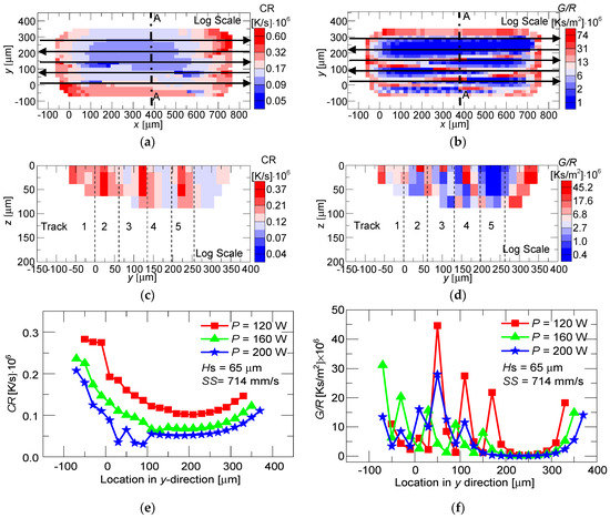 The CR map and G/R map at the top surface of the powder bed and cross-section (A-A in Figure 1) are shown in Figure 4a–d at P = 120 W, Hs = 65 µm, and SS = 715 mm/s. Laser power was continuously added to the next track during the multi-track laser melting process. The energy input to the powder bed changed the melt pool size and altered the temperature distribution. The color maps show that these solidification parameters were higher at the edge of the melt pool than in the center. This observation is most remarkable for the G/R distribution shown in Figure 4b. Meanwhile, the magnitudes of the CR and G/R near the maximum depth of the melt pool were much higher than those at the melt pool surface.