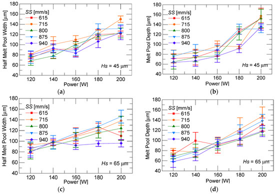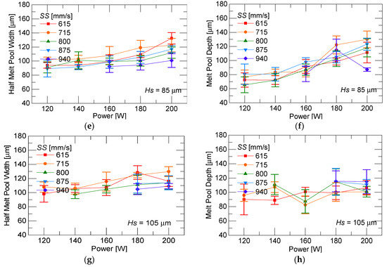 Figure 6a–h contain experimental melt pool measurements as a function of laser power, scan speed and hatch spacing. Figure 6a–f show that melt pool size increased with laser power and decreased with scan speed at lower hatch spacing (45–85 µm). However, at a wider hatch spacing of 105 µm, melt pool size did not show a clear trend with respect to laser power and scan speed. This is attributed to the fact that wider hatch spacing causes less heat buildup from subsequent laser tracks; therefore, the melt pool was mainly affected by a single laser track.