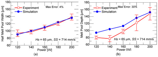 Experiment vs. simulation (a) half melt pool width and (b) melt pool depth with respect to laser power for hatch spacing of 65 µm and scan speed of 715 mm/s.
