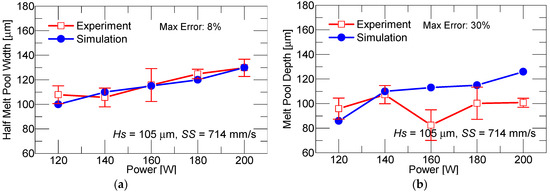Experiment vs. simulation (a) half melt pool width and (b) melt pool depth with respect to laser power for hatch spacing of 105 µm and scan speed of 715 mm/s.