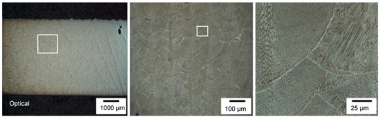 Figure 9 contains optical micrographs at different magnifications of a 304L stainless steel sample built at laser power of 180 W, hatch spacing of 65 µm, and scan speed of 940 mm/s. These graphs display the cellular grain structure of the sample. The austenitic phase of the sample is also highlighted in the figure through the dark gray shading. Cellular grain structure and austenitic phase seen in the figure were common features throughout the built samples.