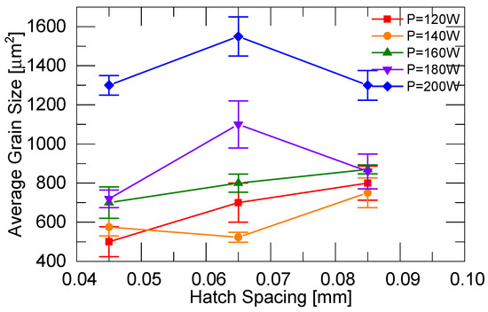 The average grain size in samples was measured following procedures outlined in ASTM E1382-97 [48]. The measured samples had hatch spacing from 45 μm to 85 μm and were subjected to laser power from 120 W to 200 W. Figure 10 shows the average grain size with respect to hatch spacing and laser power. It is seen that grain size increased with higher laser power because high energy input into the melting process led to a decrease in the cooling rate. For example, the measured grain sizes increased from 487 μm2 to 711 μm2 to 826 μm2 with hatch spacing increases from 45 μm to 65 μm and 85 μm when subjected to laser power of 200 W. It is noted that grain size correlates to cooling rate, with larger grain size resulting from slower cooling rates [43,44]. Therefore, the slower cooling rates at higher laser power resulted in larger grain sizes. This result is consistent with model predictions of lower cooling rates at higher laser power shown in Figure 4e.
