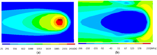 (a) Temperature contour when laser travels to point 1 and (b) thermal stress corresponding to (a).