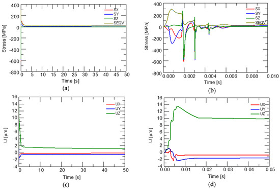 The evolution of three deformation components at point 2 is illustrated in Figure 13c, d. Like the evolution of stress components, all deformation components presented complicated variation in the laser heating process (t < 0.00625 s) and eventually reached constant as the part cooled down to room temperature. The final deformation components in X, Y and Z direction were 0.13 μm, −0.055 μm and 1.1 μm, respectively. It is worth noting that the maximum of the deformation component in the Z direction was much larger than other two components, almost 14 μm at t = 0.00625 s.