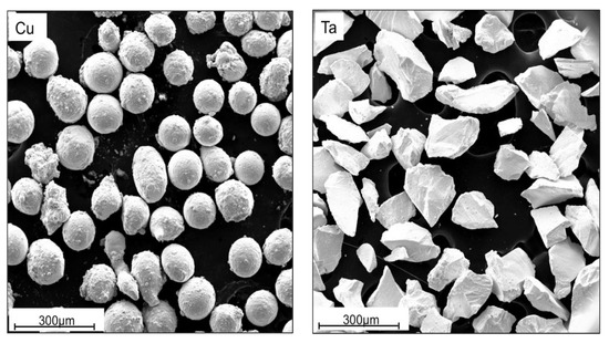 The Cu and Ta powders used in this investigation are pictured in Figure 1. Their size and aspect ratio were found by analyzing scanning electron microscopy (SEM) images with the Fiji ImageJ software [40].