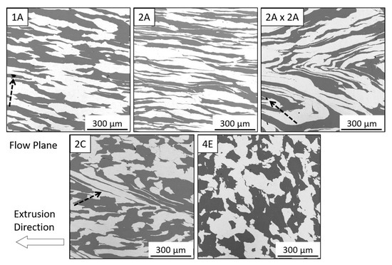 The scanning electron micrographs in Figure 2 show materials processed by routes 1A, 2A, 2A × 2A, 2C and 4E at ambient temperature. Ta is the brighter phase. Images are taken along the flow plane of extrusion; the arrow indicates the extrusion direction. Visual inspection suggests that the constituents are well-consolidated, with intimate contact between the Cu and Ta phases and no apparent porosity. Route 1A (top left) produced an elongated microstructure, as anticipated. A small pore can be seen in the copper phase at the interface of the Ta phase which is indicated by an arrow. In the 2A material (top middle), the substantial increase in elongation over the 1A is clearly evident. This outcome is to be expected, as the degree of elongation compounds with each route A type extrusion.
