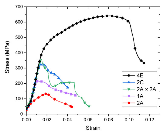 The mechanical response of the room temperature processed composites was evaluated by quasi-static (10−3/s) compression testing. Characteristic experimental stress-strain curves for each test condition are shown in Figure 3. The curves presented are representative of the individual cases and were selected to illustrate the differences in mechanical behavior of each processing condition. Two sets of compression tests were conducted; the first was under monotonic loading, displayed in Figure 3, and the second with periodic unloads. For most samples, 1A, 2A, 2A×2A and 2C, a pronounced load drop occurred before unloading could be applied, or shortly thereafter.