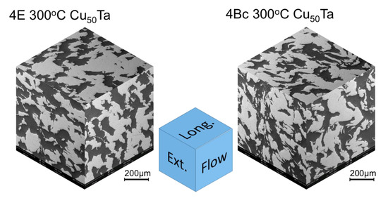 3-D representation of microstructure along three different sectioning planes in Cu-Ta composites consolidated at 300 °C by routes 4E and 4Bc.