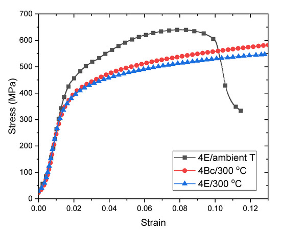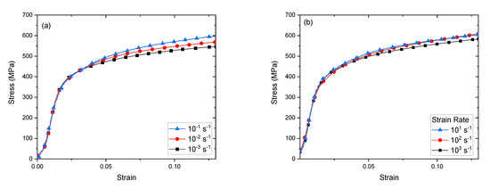 To assess strain rate sensitivity, the 300 °C -processed composites were further tested under two additional strain rates along the extrusion direction (ED): 10−2/s and 10−1/s. Corresponding stress-strain curves are shown in Figure 7. A summary of the results for all testing directions and strain rates is shown in Table 3. The strain rate sensitivity exponent m was calculated by determining the slope of the log-log plot of strain rate vs. stress at stains at 5% and 10%. For the 4E material the strain rate sensitivity exponent m is 0.0115 ± 0.01 at 5%, and 0.016 ± 0.001 at 10% strain, while for the 4Bc material, m is 0.0121 ± 0.012 at 5% and 0.012 ± 0.006 at 10% strain.
