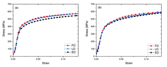 Mechanical anisotropy in the 300 °C-processed materials was investigated by conducting quasistatic (10−3/s) compression tests in the three orthogonal ECAE directions: longitudinal (LD), extrusion (ED) and flow (FD), as shown in Figure 4. Stress-strain curves for the 4E and 4Bc 300 °C tests are shown in Figure 6a,b. Both materials are plastically isotropic, to a good approximation. The largest deviation in isotropy occurs for deformation of the route 4E material along the extrusion direction (ED). The greater anisotropy in 4Bc material may be due to the increase in phase interface area noted in Table 2. This greater interface area likely results in improved bonding, and a more homogenous mechanical response and may also increase strength.