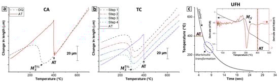Dilatometric curves obtained during the cooling step, i.e., after the annealing treatments for samples (a) CA and (b) TC. (c) Temperature profile obtained during cooling for the ultrafast heated sample; the insert in (c) shows the estimation of the MS temperature via differentiation of the recorded cooling curve.