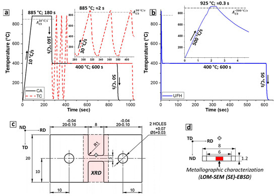 Record of the thermal treatments carried out in the Gleeble simulator: (a) CA and TC samples; (b) UFH sample. The inserts in (a) and (b) show the actual temperature recording for the TC and UFH samples, before the austempering step. Horizontal dotted lines denote the AC3 temperatures estimated by dilatometry. (c) Dog bone geometry and (d) area used microstructural characterizations (dimensions in mm). The area enclosed by dashed lines indicates the homogenously heat-treated zone obtained in samples treated using the Gleeble simulator. The cross next to the central region of the gauge length indicates the area used for metallographic characterization.