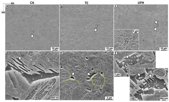 To evaluate whether ferrite was formed upon cooling, after the annealing steps, an initial microstructural characterization was performed by means of SEM analysis on directly quenched samples (Figure 4). The microstructure of direct quench samples consists predominantly of a lath martensitic (M) matrix, and allotriomorphic ferritic (F) grains are also distinguished (dark gray grains in Figure 4). Ferritic grains of about ≈ 1 µm size are observed at parent austenite grain boundaries in CA (Figure 4a) and TC (Figure 4b,e). Widmanstätten ferrite plates (FW) [38] were also detected in CA (Figure 4d). A ferrite fraction lower than 1% was obtained after fast cooling for CA, while 2.5 (±0.5)% of ferrite was quantified for TC. The UFH sample mainly consists of martensite and 8.5 (±0.4)% of ferrite with an average grain size of 1.2 (±0.5) µm (Figure 4c). Regions with undissolved spheroidized and lamellar cementite particles (θ) are presented in Figure 4f.
