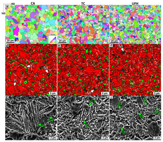 (a,d,g) CA, (b,e,h) TC and (c,f,i) UFH. Microstructures obtained after isothermal holding at 400 °C for 600 s: The first row of images presents the inverse pole figure of the reconstructed PAGs. EBDS IQ-Phase maps and secondary electron images are shown in the second and third row of images, respectively. Retained austenite grains (FCC) appear highlighted in green in the combined IQ-Phase maps, while bainite, ferrite and martensite appear red. White and black lines delineate boundaries of misorientation angle between 5–15° and 15–63°, respectively. M: Martensite; γ: Retained austenite of film (γF) and blocky-type (γB) morphologies. M/γ: martensite-retained austenite constituent; θ: undissolved cementite particles. Note that the magnification increases from the first to the third row of images.
