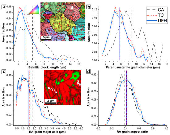 Grain size distribution: (a) bainitic block length. (b) reconstructed parent austenite grain size diameter. (c) retained austenite grain diameter. (d) retained austenite grain aspect ratio. Vertical lines denote the average value for each distribution. In (a), an IPF of reconstructed PAGs is presented together with the respective IQ map of the “child” bainitic blocks (B) formed after austempering for the CA sample. Retained austenite grains are enclosed by red boundaries. Film (γF) and blocky-like (γB) RA grains are highlighted in (c).