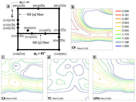 ODF at φ2 = 45° section of the Euler space. (a) main texture components of rolled BCC crystals. (b) 70% cold-rolled material. (c) CA. (d) TC. (e) UFH. (Scanned area 22,500 µm2).