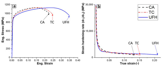 Tensile engineering stress–strain and strain hardening rate v/s true strain curves are shown in Figure 8a,b, respectively. Mechanical property values are summarized in Table 3. Bainitic steels produced in this study display continuous yielding and comparable values of ultimate tensile strength (σUTS). Yield strength (σys) values of 895 MPa, 869 MPa and 862 MPa were measured for samples CA, TC and UFH, respectively. The obtained σUTS ranged from 1130 to 1135 MPa. Tensile testing, specifically the uniform (εu) and total (εtotal) elongation values, revealed a considerable difference in ductility for UFH with respect to samples CA and TC. In CA and TC steels, εu and εtotal are similar with values close to ≈0.15 and 0.25, respectively. The sample UFH shows an εu and a εtotal of 0.24 and 0.35, respectively. The reported difference in the elongation values represents an increment of 60% in εu and 40% in εtotal for the sample UFH with respect to CA and TC. Absorbed energy values of 251 MJ/m3, 268 MJ/m3 and 375 MJ/m3 were determined for CA, TC and UFH, respectively.