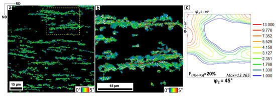 The ODF of the UFH sample (Figure 7e) shows that the general characteristics of the BCC texture are almost the same compared with the as-received material (Figure 7b). This phenomenon can be explained in terms of the texture memory effect hypothesis [46] and similar results have been previously reported for different ultrafast heated steel grades, including Q&P steels [18,19,20,44]. In this work, evidence of austenite formation and its interaction with non-recrystallized ferrite (F(Non-RX)) during the heating process is presented. Figure 9 shows selected F(Non-RX) grains in an intercritical annealed sample heated at 500 °C/s to 800 °C and quenched with no soaking time. A high density of dislocations is indirectly observed in the 1st neighbor kernel average misorientation maps exhibited in Figure 9a,b, proving that ferrite is in a non-recrystallized state during austenite formation. The ODF map presented in Figure 9c supports this observation.