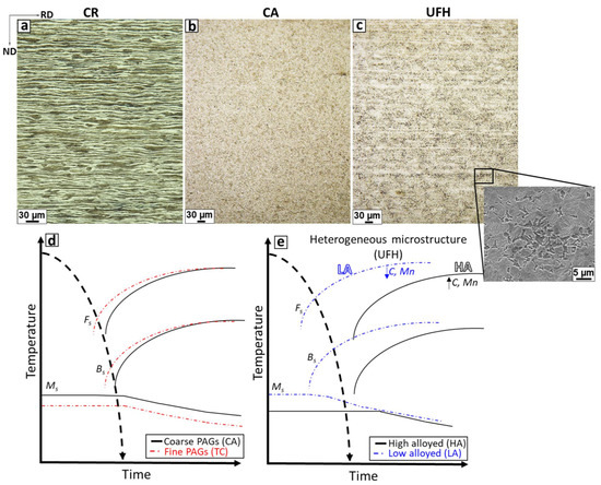 The microstructure produced after a predefined thermal treatment depends on the chemical and morphological characteristics of the parent austenite and subsequent thermal pathways. In this study, a fast-cooling rate of 160 °C/s was employed after the initial annealing step. This approach makes it possible to elucidate the characteristics of the parent austenite based on the microstructure obtained after cooling. Figure 10 shows the microstructure of the as-received ferritic–pearlitic steel (Figure 10a) together with samples CA (Figure 10b) and UFH (Figure 10c) directly cooled to room temperature (the microstructure of TC is presented in Figure 4b). Clear differences are observed between CA and UFH. In the UFH steel, a banded microstructure that resembles the ferritic–pearlitic bands of the as-received cold-rolled material was obtained. The insert in Figure 10c shows that the darker areas in the optical micrograph are mainly composed of fine-grained ferrite, as it was presented previously in Figure 4c. Contrarily, even distribution of microconstituents was found in CA and TC. The influence of the prior annealing strategies on the produced microstructures is exemplified using schematic continuous cooling transformation diagrams (presented in Figure 10d,e).
