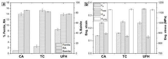 The distribution of microconstituents and corresponding mechanical properties obtained after austempering are summarized in Figure 11. The results indicate that the σUTS values are insensitive to the processing history and microstructure. This observation agrees with the findings reported by Kumar et al. [56], where a saturation of the strength level was obtained in dual-phase steels with bainite or martensite content higher than 60%.