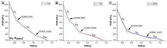 Strain hardening behavior plotted according to the modified C-J analysis in samples (a) CA, (b) TC and (c) UFH. Values indicated in parenthesis at the inflection points of the strain hardening curves correspond to the true strain and true stress, respectively (true strain; true stress).
