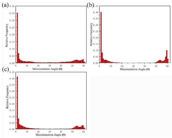 3.4. Grain Orientation Image Maps and Grain Boundary Misorientation Distribution