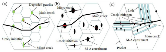 - Chen, J.H.; Wang, G.Z.; Wang, Q. Change of critical events of cleavage fracture with variation of microscopic features of low-alloy steels. Metall. Mater. Trans. A 2002, 33, 3393–3402. [Google Scholar] [CrossRef]