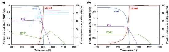 Comparing Figure 1a,b, one can see that the temperature range of the primary L12 phase formation is almost the same during solidification. The primary L12 particles can form below 990 K. Liquidus of α-Al is similarly about 910 K. The end of solidification for this phase is treated in JMatPro according to Scheil’s equation. This is not included in the current model. As addressed further below, the solidification of α-Al is examined using the common CA analysis based on the local undercooling and the growth kinetics model.