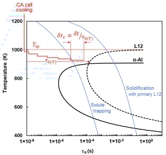 Figure 2. Calculated curves of characteristic incubation time ( τ 0 ) of competing phases. Two distinguished cooling conditions corresponding to the formation of primary L12 and solute trapping are superimposed. An example of the evolution of the normalized particle formation time in a CA cell ( τ v ) is depicted as well (see Section 2.2).