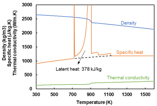 This section explains the methodology proposed to incorporate the evolution of L12 phase into the development of an AM solidified microstructure. This is carried out in the framework of a CA model. To address the very fine grain size within the FG zone, a very small CA cell size ( Δ x ) is required. However, a 3D model with submicron Δ x has an unaffordable computing cost. Therefore, two different CA models are developed (Figure 3). The domain for the 3D analysis is of the size 500 µm × 300 µm × 190 µm (SD × TD × BD; SD, TD, and BD represent the scan, transverse, and built directions, respectively) discretized in cells of the size Δ x = 1 µm. The semi-2D domain is 5 µm × 300 µm × 175 µm (SD × TD × BD) with a cell size of Δ x = 0.25 µm. Both domains are initialized by a non-textured grain structure with an average grain size of 10 µm. As shown in Figure 3, a steady-state thermal field moves across both domains. The thermal field is generated by a forward-time centered-space finite difference (FD) analysis [31]. The FD domain is 900 µm × 500 µm × 275 µm discretized in cells of size 5 µm. The heat source is modeled by a volumetric Gaussian distribution of heat flux within a beam radius of 100 µm with a total input power of 100 W. Two different scanning speeds of 500 and 1000 mm/s and platform temperatures of 298 and 473 K are considered to evaluate their impacts on the resultant microstructures. For further information on the FD analysis, the reader is referred to the authors’ earlier publication [16]. The thermophysical properties of the alloy are derived as functions of temperature using JMatPro® (Figure 4). To account for the Marangoni effect, the thermal conductivity of the liquid is enhanced by a factor of 2.5 [32]. The contributing latent heat of phase transformations is also integrated into the heat capacity. As shown in Figure 4, the overall value of latent heat is 378 kJ/mol.