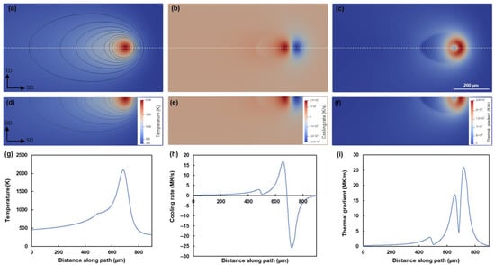 Figure 5. FD thermal field calculated under scanning speed of 1000 mm/s; distributions of temperature (a,d,g), cooling rate (b,e,h), and thermal gradient (c,f,i) in the top surface (ac), the longitudinal cross-section (df) and the path (gi). The path is defined in the view of the top surface (ac). Isotherms from 500 to 1200 K with 100 K interval are plotted in (a,d).