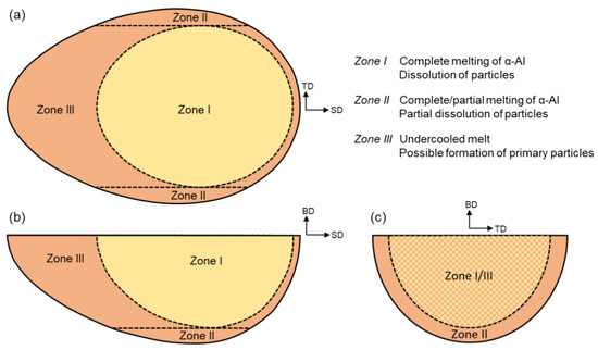 Figure 7. Schematic demonstration of different zones involved with particle evolution during heating and cooling by laser scanning: (a) top view, (b) TD cross-section, and (c) SD cross-section.