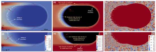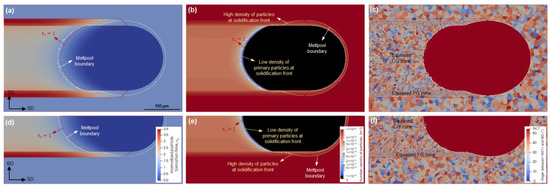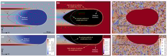 Figure 9 presents the results for a scanning speed of 500 mm/s. The platform temperature is similar to the previous case in Figure 8, i.e., 298 K. It can be seen that an entirely different scenario occurs under this condition. That is, the τ v   = 1 locus lays in the meltpool area. This means that the primary L12 particles can form in the undercooled liquid ahead of the solidification front. However, since the interval between the beginning of precipitation ( τ v   = 1) and the solidification front is quite short, only a small number of particles are expected to form. This is confirmed in Figure 9b,e. A portion of the primary L12 particles will contribute to α-Al nucleation, leading to new equiaxed grains within the associated region in Figure 8c,f. Therefore, the resulting microstructure is quite different from that of Figure 8, namely, zones II and III both solidify in equiaxed grains. Furthermore, since nucleation prevails over epitaxial growth, the solidification front moves to lower undercoolings, implying a less elongated meltpool as compared to the previous case in Figure 8. It is worth noting that the evolving grain structures of the two zones remain still remarkably different, so that the extremely high density of the particles in Zone II leads to very fine grains, whereas the equiaxed grains within the solidified Zone III are significantly coarser.